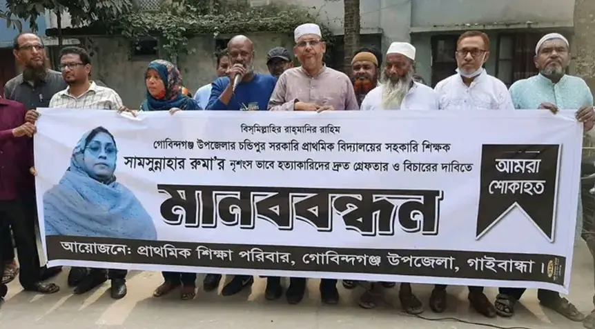গাইবান্ধার গোবিন্দগঞ্জ পৌর শহরে নিজ বাড়িতে চন্ডিপুর সরকারি প্রাথমিক বিদ্যালয়ের সহকারী শিক্ষিকা সামছুন্নাহার রুমা হত্যাকাণ্ডের প্রতিবাদে এবং জড়িতদের দ্রুত বিচারের